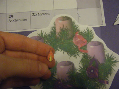 - La idea es que cada semana, se abra el triángulo correspondiente y se pegue la llamita sobre la vela de la corona que toque (El primer domingo 1 vela morada, el segundo 2 velas moradas, el tercero 2 moradas y la rosa y el cuarto domingo todas).