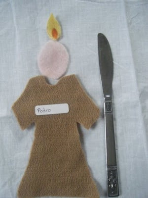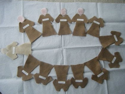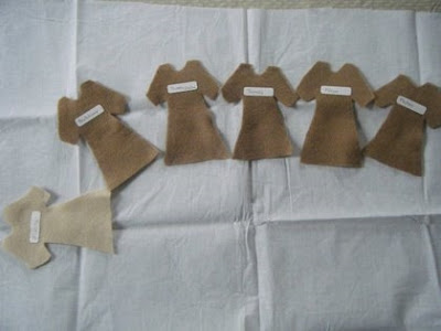 Recorta las doce túnicas para los apóstoles, y la de María. Después escribe los nombres de los apóstoles en las etiquetas y pónselas a cada uno. Recorta óvalos para las caras y unas llamitas (yo las hice amarillas y usé plumón rojo para la llama de enmedio).