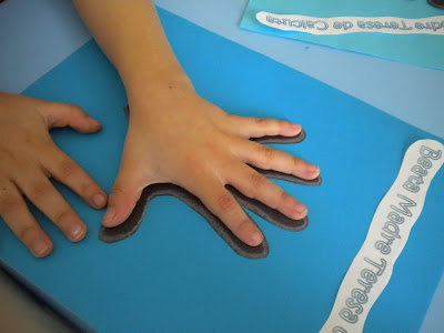 - Los niños más pequeños, dibujaron su mano en papel negro y después decoraron una página, usando un archivo que hice con las palabras de la Madre Teresa: