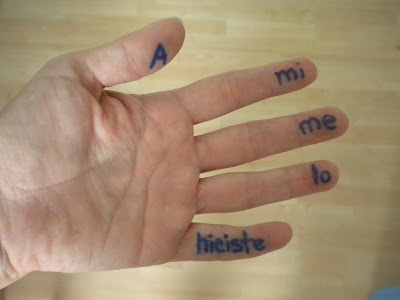 Los niños más grandes y yo nos escribimos en los dedos de una mano las palabras: "A-mi-me-lo-hiciste". Usamos un marcador sharpie (normalmente no me gusta que los niños se pinten las manos, pero claro que siempre se pueden hacer excepciones; de todas maneras, se nos borró depués de unas cuantas lavadas de manos)