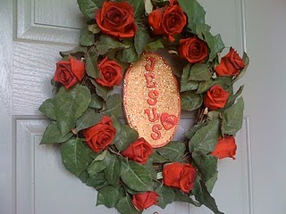Arreglo floral con el Nombre de Jesús hecho con letras de madera