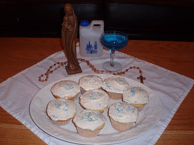 - Haz unos panquecitos con betún blanco para celebrar la pureza de nuestra Madre y una gelatina azul (el color de María) . Recuerda que ella le dijo a Santa Bernardita que ella era la Inmaculada Concepción. Esta idea la puedes ver en The Careless Catholic.