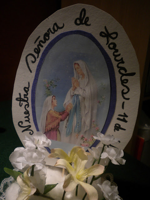 Para esto puedes usar alguna estampita de Nuestra Señora de Lourdes o imprimir de internet cualquier imagen que te guste. Esta es la que yo usé. Sólo que, como venía cuadrada, la copié en MSWord y le agregué un óvalo celeste por detrás para que se viera mejor. ¿verdad que ni parece?