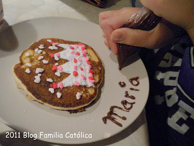 Para empezar nuestra celebración de este día, decoramos nuestros hotcakes del desayuno con una corona y escribimos con chocolate en el plato "María Reina". Esto nos dió la oportunidad de comentar sobre el hecho de que María no sólo es nuestra Madre, sino también, nuestra Reina.