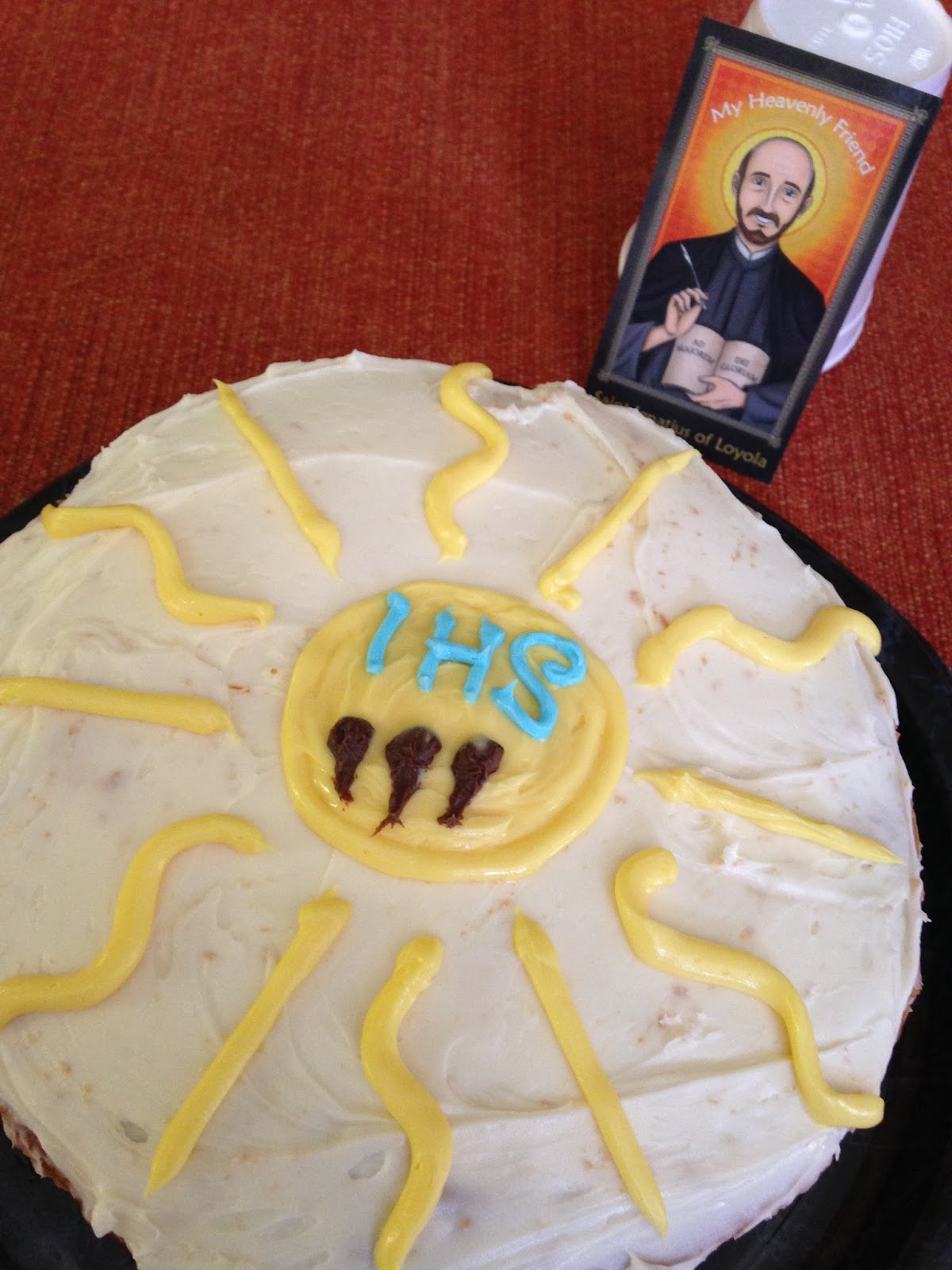 "San Ignacio de Loyola fue, ante todo, un hombre de Dios, que en su vida puso en primer lugar a Dios, su mayor gloria y su mayor servicio; fue un hombre de profunda oración, que tenía su centro y su cumbre en la celebración eucarística diaria. De este modo, legó a sus seguidores una herencia espiritual valiosa, que no debe perderse u olvidarse. Precisamente por ser un hombre de Dios, san Ignacio fue un fiel servidor de la Iglesia, en la que vio y veneró a la esposa del Señor y la madre de los cristianos. Y del deseo de servir a la Iglesia de la manera más útil y eficaz nació el voto de especial obediencia al Papa, que él mismo definió como 'nuestro principio y principal fundamento'". Papa Benedicto XVI, 2006Ela año pasado celebramos la fiesta de San Ignacio de Loyola haciendo este pastel con el emblema de la Orden de los Jesuitas... Lo buscamos en internet y con betún de colores mi hija y otra amiguita lo dibujaron en el pastel. Aprovechamos para hablar sobre el hecho de que tenemos ¡el primer Papa Jesuita!