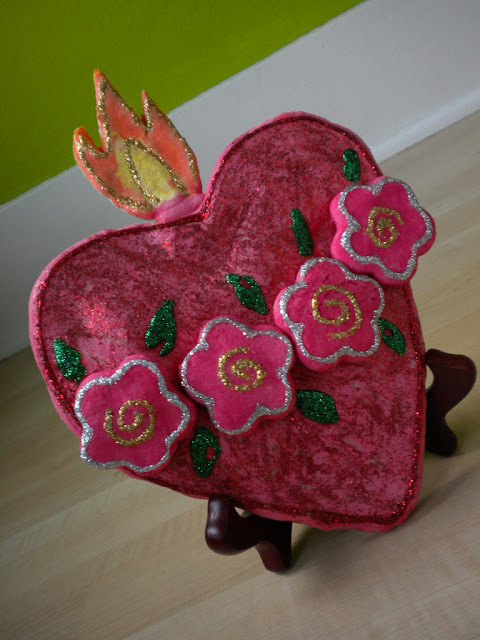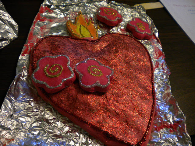 Aquí se ve después de que lo pintaron las niñas: el corazón rojo, las flores rosas y la llama naranja y amarillo. Trata de que si no le pongan mucha pintura para que no se remoje la masa (por eso pienso que lo mejor es pintar la masa antes de hornearla), en fin, no me acordé de este detalle.