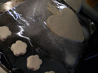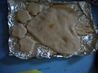 Después de mezclar bien la masa, formamos el corazón con la llama en la parte de encima y luego hicimos unas flores con unos moldes que ya teníamos. Nosotros no pintamos la masa con colorante vegetal, pero creo que, quedaría mejor.  En la foto de la derecha se ve cómo quedó después de hornearla (en esta ocasión, dejé más tiempo la masa en el horno para que quedara más dura, y creo que me dió mejor resultado).