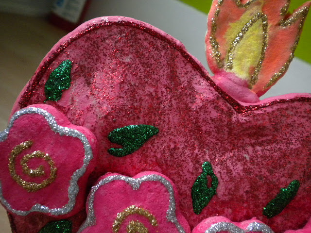 Antes de pegar las flores, le agregamos glitter como decoración, incluyendo las hojas verdes: